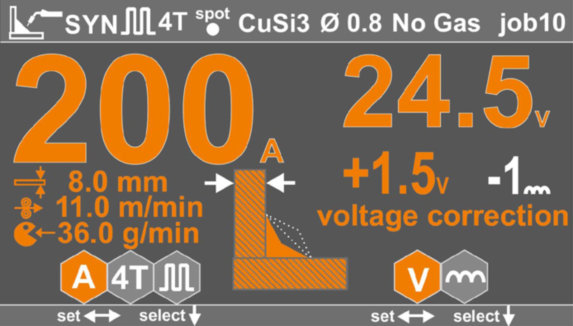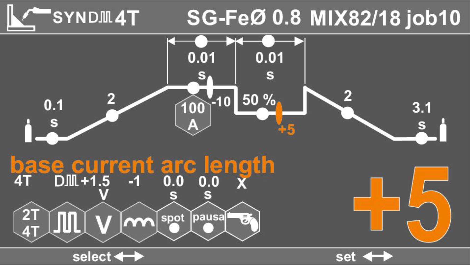 K dispozici je 10 pamětí pro uložení svařovacích parametrů (jobů), které lze snadno vyvolat na ovládacím panelu.