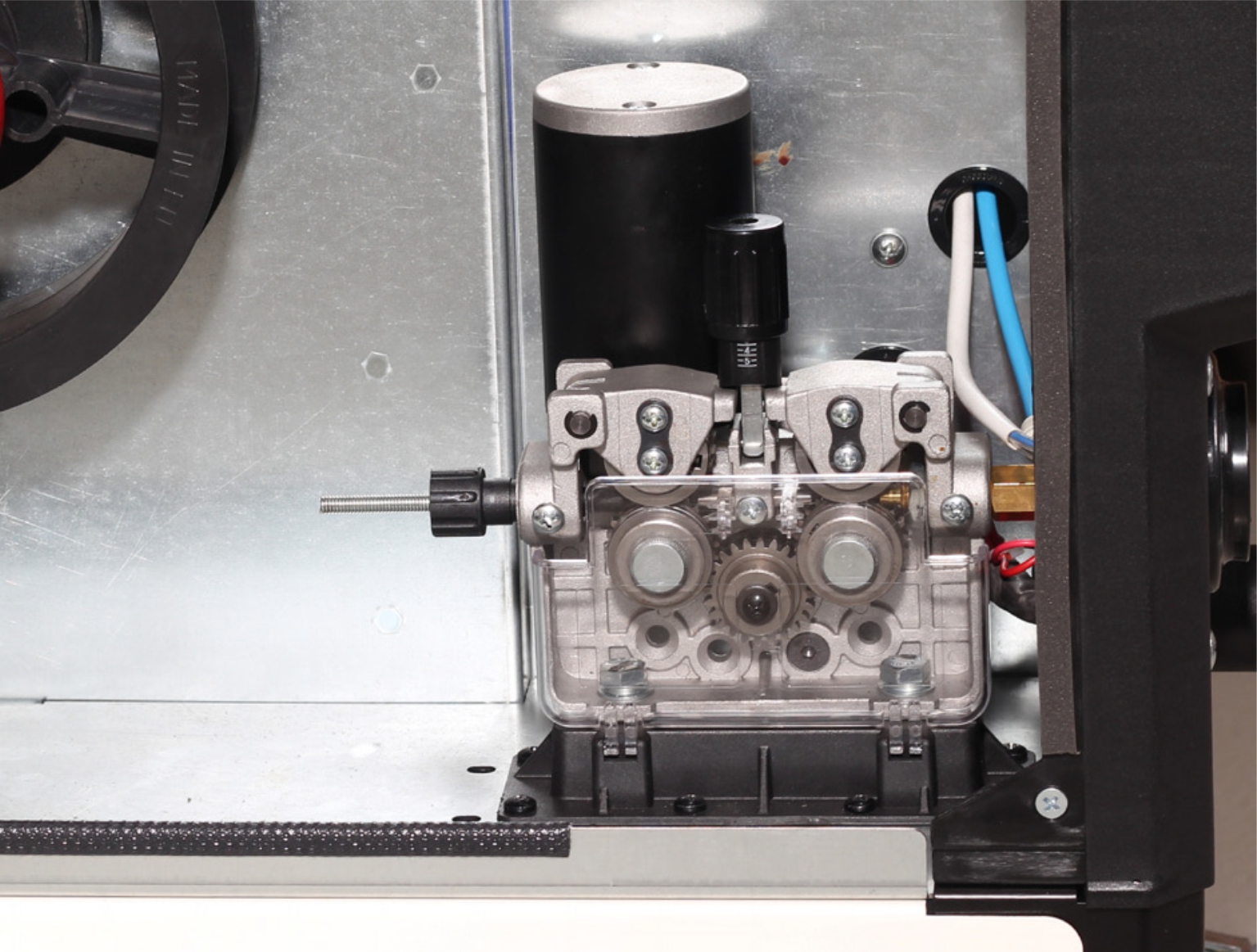 Výkonově je svářečka vhodná pro dráty o průměru 0,6-1,2 mm, použít lze cívky o průměru 200 mm (do 5 kg) a 300 mm (do 18 kg). Svářečka je vybavena čtyřkladkovým posuvem drátu s podávacími kladkami 22/30 - poháněné jsou nejen kladky podávací, ale i kladky přítlačné. Manipulaci s drátem nebo výměnu kladek usnadňuje LED osvětlení vnitřního prostoru podavače.