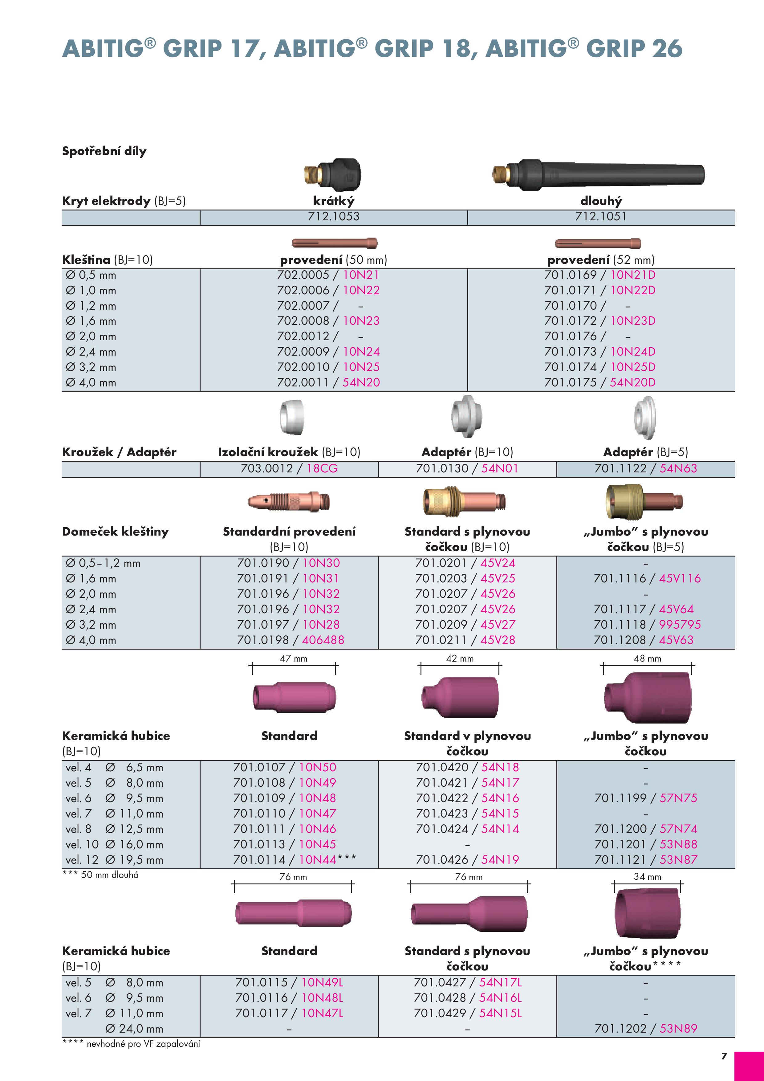 Spotřební díly TIG pro plynem chlazené hořáky ABITIG GRIP 17/26 a kapalinou chlazené hořáky ABITIG GRIP 18 jsou zcela shodné a souhrnně se označují jako díly pro TIG hořáky 17/18/26. Specializujeme se na produkty společnosti ABICOR BINZEL, které jsou kompatibilní s mezinárodním standardem a je možné je použít i pro mnoho typů hořáků od jiných výrobců - ESAB (TXH, SR-B, Exeor), KÜHTREIBER (KTB), PARKER (SGT), TBi apod.