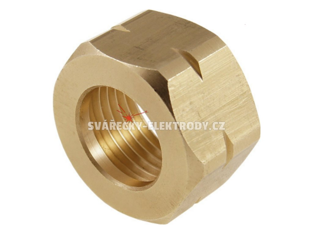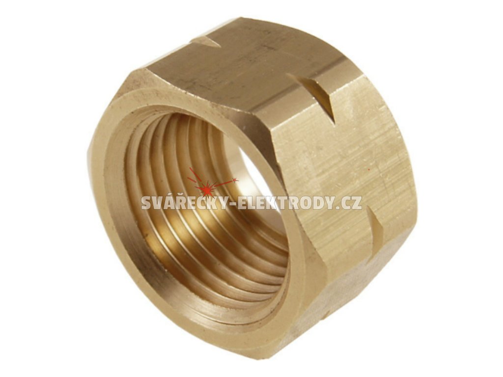 Převlečná matice vstupní přípojky redukčního ventilu. Závit W 21,8 x 1/14" LH. Pro propan-butan, vodík, formovací plyny. Materiál mosaz MS 58.