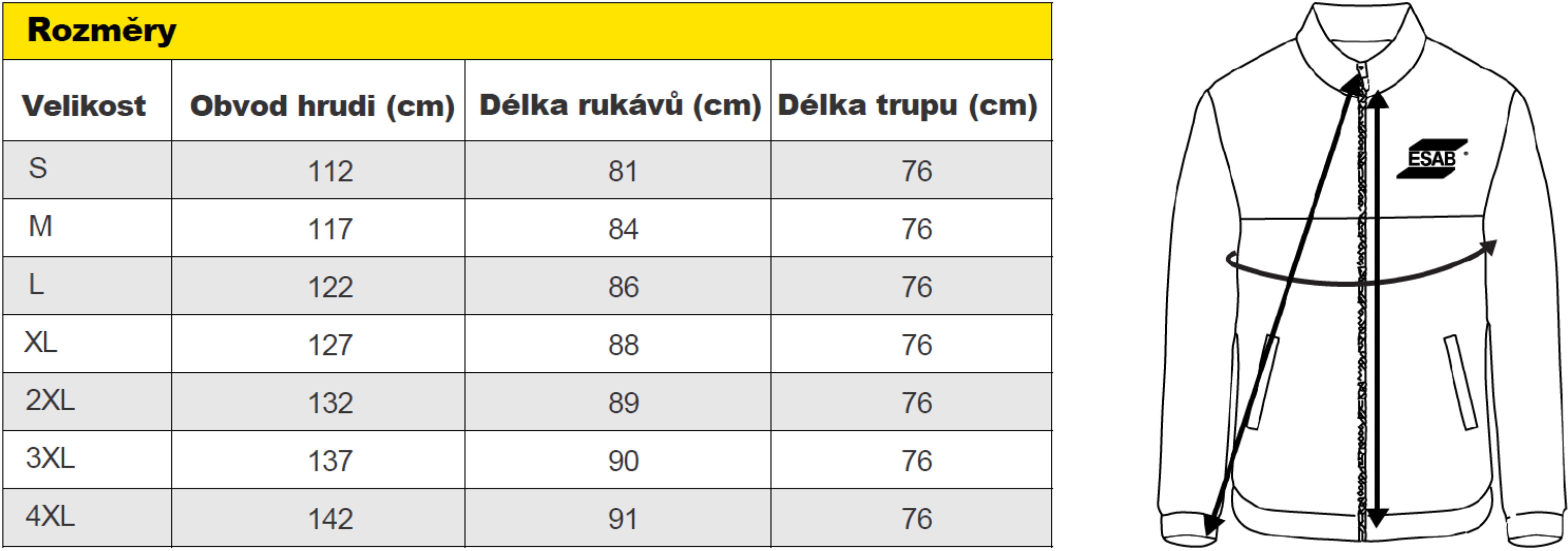 Bunda dobře padne díky velkým rukávům s nastavitelnými manžetami, klínky v podpaží pomáhají při svařování nad hlavou a zajišťují, aby rukáv vždy zakrýval celou paži.