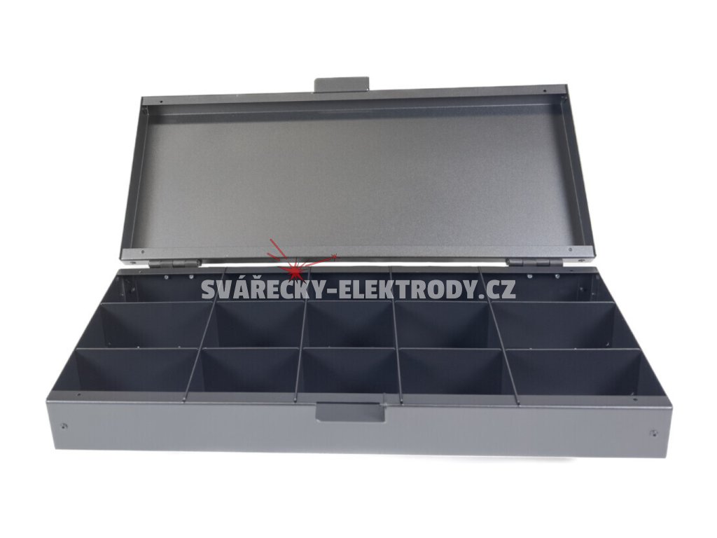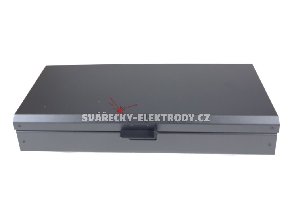 Plechová úložná schránka na nářadí a příslušenství určená pro svářečky ESAB Rustler. Vnitřní prostor rozdělen přihrádkami. Možnost uzamčení.