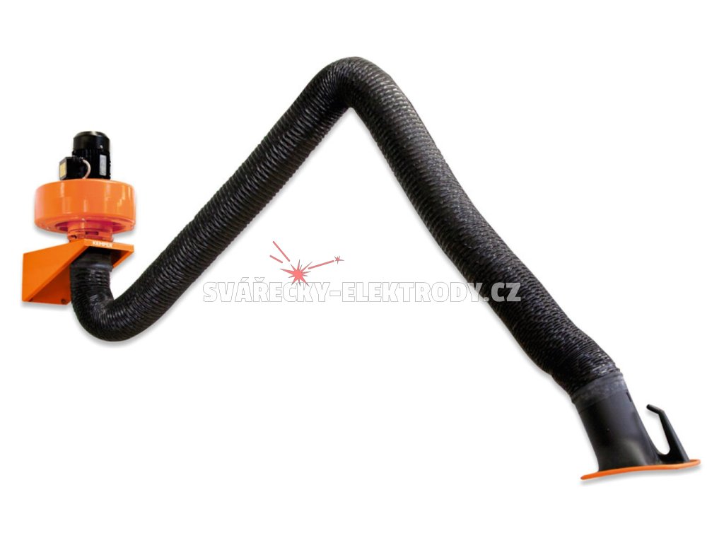 Výfuková sada s odsávacím ramenem a ventilátorem pro odvod kouře a prachu. Ventilátor 3×400 V. Výkon motoru 0,75 kW. Odsávací výkon 1100 m3/hod. Délka 4 metry.